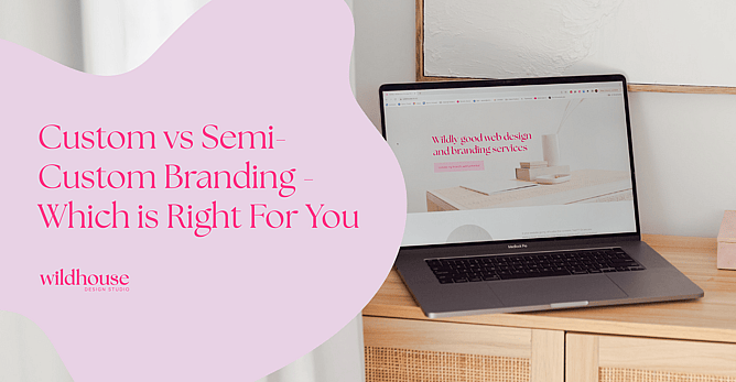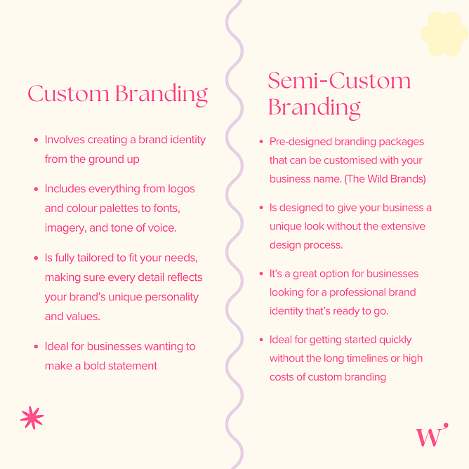 Semi-custom brand kits (like The Wild Brands) are pre-designed packages we customise with your business name. You get a logo, colour palette, fonts, and brand guidelines without the lengthy design process.