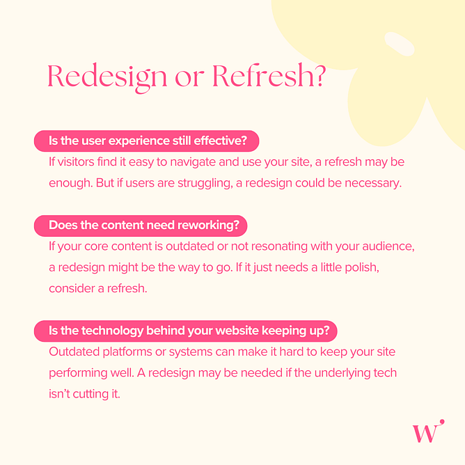 The choice depends on your business needs and where your site's at. A redesign is a bigger, long-term investment. A refresh is a faster way to stay sharp and relevant.
