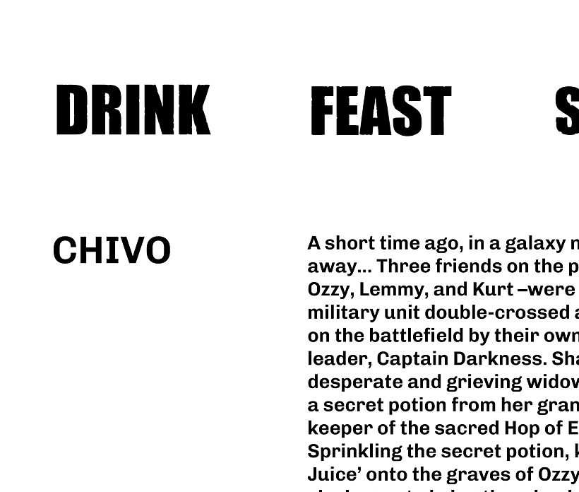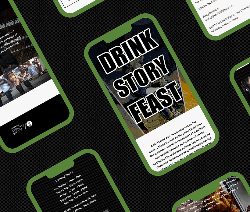 Think high-impact comic art, tongue-in-cheek illustrations, and storytelling-first framed layout. With bold headers like Drink. Story. Feast., the design captures Boneface’s gritty, playful identity and brings their product range into focus.