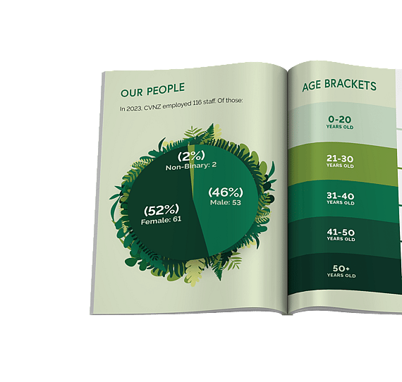 For their 2023 Annual Report, Protecting People and Planet, Community Volunteers New Zealand (CVNZ) once again partnered with Wildhouse to bring their vision to life. This year’s theme celebrates CVNZ’s impact on environmental and community stewardship, with a design inspired by New Zealand’s natural beauty.