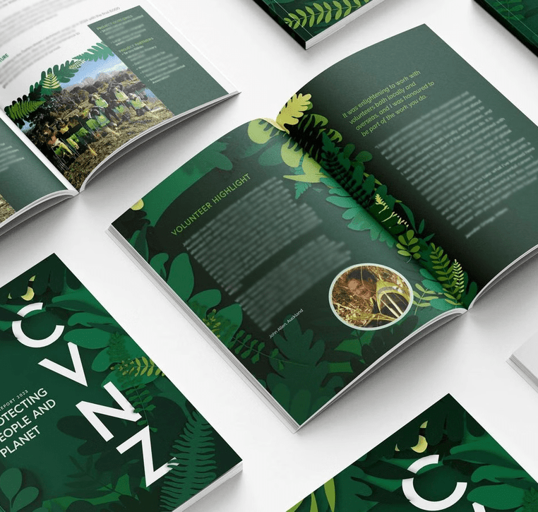 For their 2023 Annual Report, Protecting People and Planet, Community Volunteers New Zealand (CVNZ) once again partnered with Wildhouse to bring their vision to life. This year’s theme celebrates CVNZ’s impact on environmental and community stewardship, with a design inspired by New Zealand’s natural beauty.