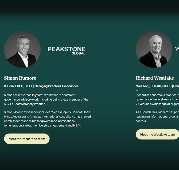 We designed a sleek one-page website to unify Westlake Governance and Peakstone Global under Global Governance Advisory. The brief: keep it sharp, simple, and strategic.