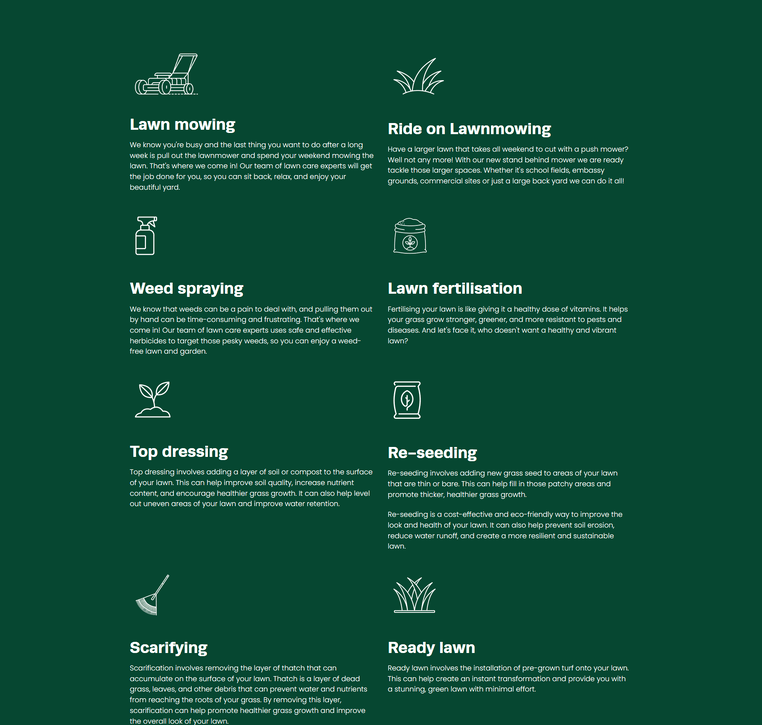 Then came the website: clean layout, green-and-white palette, custom icons, and a grass-patterned footer that grounds it all (pun very much intended).
